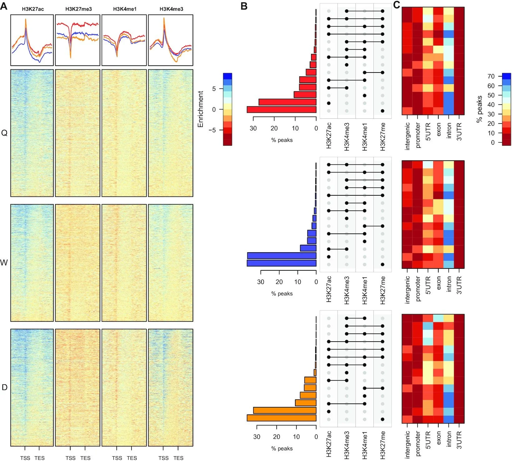 The capacity of the honey bee to produce three phenotypically distinct organisms (two female castes; queens and sterile workers, and haploid male drones) from one genotype represents one of the most remarkable examples of developmental plasticity in any phylum. The queen–worker morphological and reproductive divide is environmentally controlled during post-embryonic development by differential feeding. Previous studies implicated metabolic flux acting via epigenetic regulation, in particular DNA methylation and microRNAs, in establishing distinct patterns of gene expression underlying caste-specific developmental trajectories. We produce the first genome-wide maps of chromatin structure in the honey bee at a key larval stage in which developmental canalization into queen or worker is virtually irreversible. We find extensive genome-wide differences in H3K4me3, H3K27ac, and H3K36me3, many of which correlate with caste-specific transcription. Furthermore, we identify H3K27ac as a key chromatin modification, with caste-specific regions of intronic H3K27ac directing the worker caste. These regions may harbor the first examples of caste-specific enhancer elements in the honey bee. Our results demonstrate a key role for chromatin modifications in the establishment and maintenance of caste-specific transcriptional programs in the honey bee. We show that at 96 h of larval growth, the queen-specific chromatin pattern is already established, whereas the worker determination is not, thus providing experimental support for the perceived timing of this critical point in developmental heterochrony in two types of honey bee females. In a broader context, our study provides novel data on environmentally regulated organismal plasticity and the molecular foundation of the evolutionary origins of eusociality.